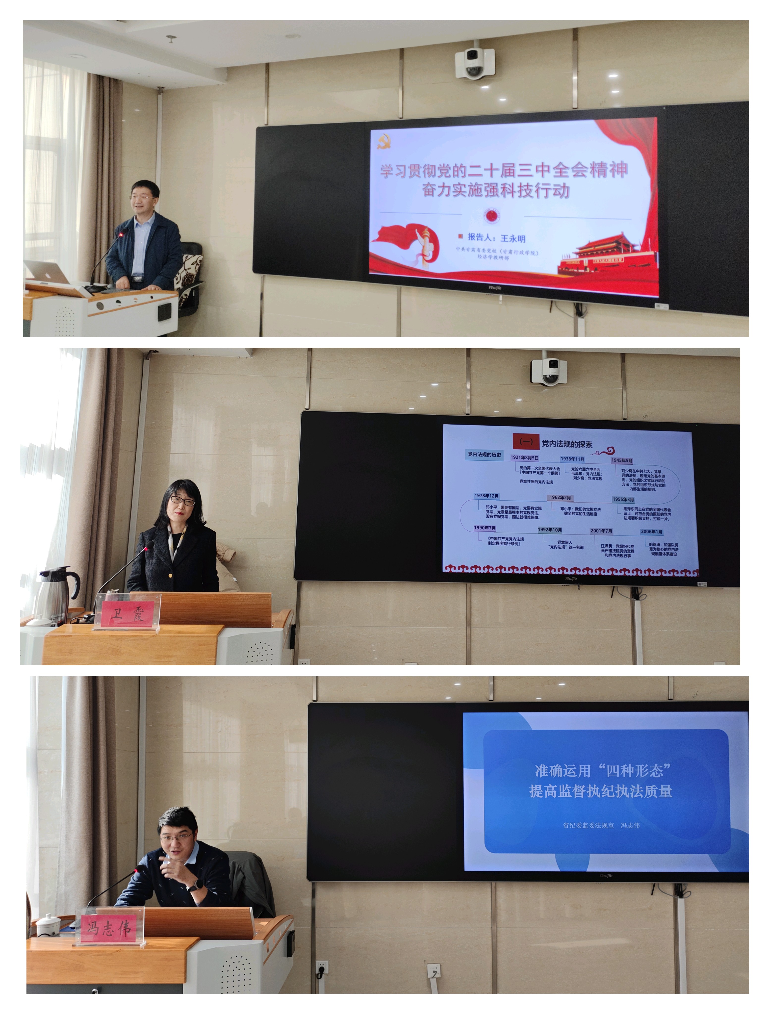 此次培訓(xùn)結(jié)合工作實(shí)際設(shè)置了三場(chǎng)專題報(bào)告、三場(chǎng)經(jīng)驗(yàn)分享和兩次警示教育。中共甘肅省委黨校(甘肅行政學(xué)院)王永明副教授和衛(wèi)霞教授,分別作題為《學(xué)習(xí)貫徹黨的二十屆三中全會(huì)精神 奮力實(shí)施強(qiáng)科技行動(dòng)》和《監(jiān)督執(zhí)紀(jì)相關(guān)黨內(nèi)法規(guī)解讀》專題報(bào)告;甘肅省紀(jì)委監(jiān)委法規(guī)室馮志偉作題為《準(zhǔn)確運(yùn)用監(jiān)督執(zhí)紀(jì)“四種形態(tài)”》專題報(bào)告。