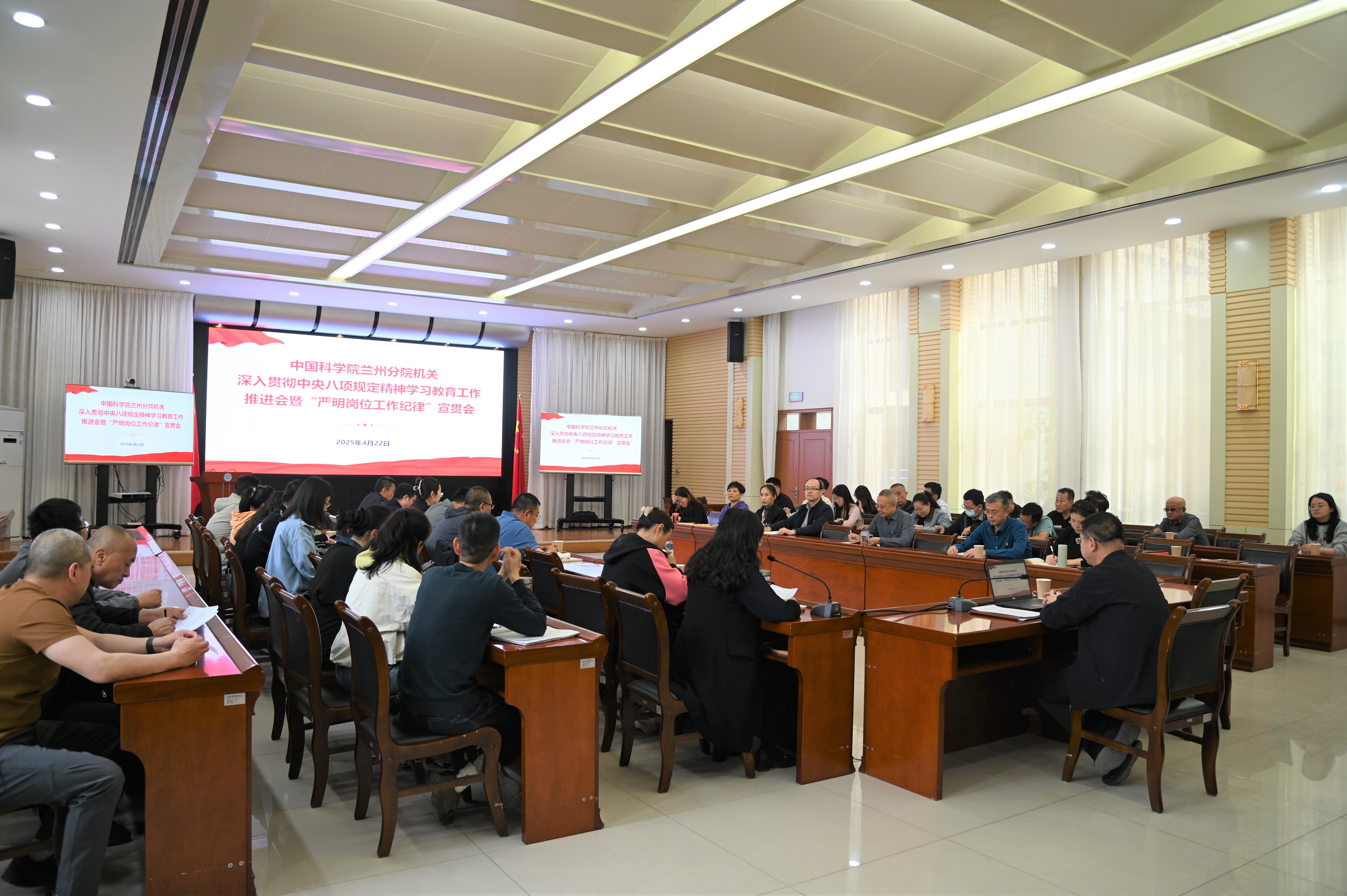 4月22日,中國科學(xué)院蘭州分院機(jī)關(guān)黨委召開深入貫徹中央八項規(guī)定精神學(xué)習(xí)教育工作推進(jìn)會暨“嚴(yán)明崗位工作紀(jì)律”宣貫會。蘭州分院分黨組成員、紀(jì)檢組組長、機(jī)關(guān)黨委書記吳建剛及分院機(jī)關(guān)在職全體黨員近50人參加會議。會議由蘭州分院機(jī)關(guān)黨委副書記曹霞主持。