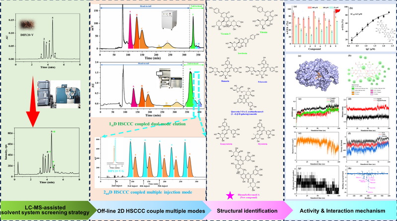 中國(guó)科學(xué)院西北高原生物研究所高原藏藥資源質(zhì)控與藥理毒理評(píng)價(jià)研究團(tuán)隊(duì)通過建立離線二維高速逆流色譜結(jié)合雙模式洗脫與重復(fù)進(jìn)樣連續(xù)洗脫的分離技術(shù),成功從唐古特大黃葉中分離得到1個(gè)亞甲基橋接的黃酮苷新型二聚體(Rheumbisflavonoid A)、3個(gè)黃酮碳苷和5個(gè)黃酮氧苷。Rheumbisflavonoid A的α-葡萄糖苷酶抑制活性顯著高于其余8個(gè)化合物。通過多維度的分子相互作用研究發(fā)現(xiàn),該化合物與α-葡萄糖苷酶具有高的結(jié)合常數(shù),通過范德華力和氫鍵作用占據(jù)α-葡萄糖苷酶的活性位點(diǎn)并形成穩(wěn)定的復(fù)合物,改變關(guān)鍵氨基酸殘基和多肽骨架的微環(huán)境,使埋藏的疏水環(huán)境暴露。此外,該化合物與α-葡萄糖苷酶結(jié)合后顯著降低其α-螺旋含量,從而使酶失去催化活性。該研究為復(fù)雜天然產(chǎn)物的分離純化及其與α-葡萄糖苷酶的相互作用機(jī)制提供了新的思路。
