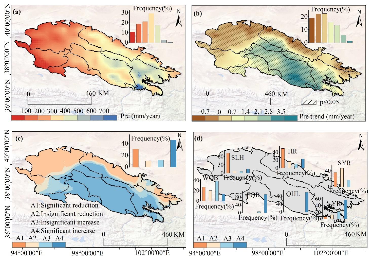 1950-2024年祁連山降水重建結(jié)果及時空變化特征。(a)重建降水的空間分布;(b) Sen’s趨勢估計與Mann-Kendall顯著性檢驗結(jié)果;(c)祁連山降水時空變化的趨勢類型;(d)各子流域降水時空變化的趨勢類型。