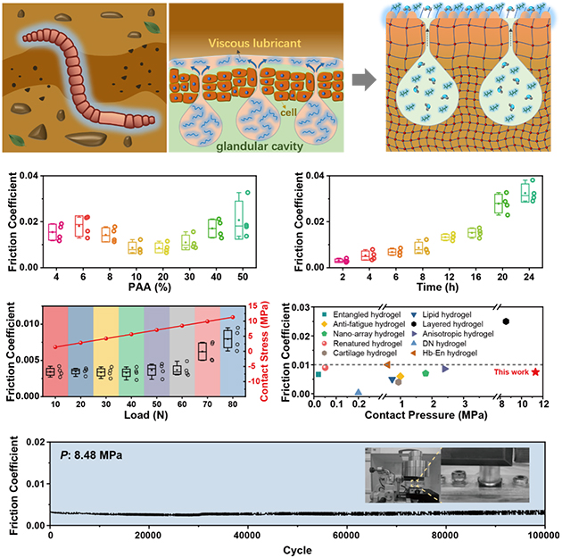 中國科學院蘭州化學物理研究所潤滑材料全國重點實驗室周峰研究員和麻拴紅研究員團隊,受自然界蚯蚓持續(xù)潤滑機制啟發(fā),開發(fā)了一種基于微量潤滑劑的聚合物凝膠超潤滑材料。
