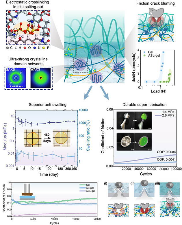 在解決聚合物凝膠材料超高承載和機械魯棒性超潤滑難點基礎之上,研究人員將關注點轉(zhuǎn)移到解決材料在苛刻鹽離子介質(zhì)中的長效力學穩(wěn)定性難題。盡管已報道的大多數(shù)聚合物凝膠材料能夠?qū)崿F(xiàn)優(yōu)異的承載與減摩功能,但其在復雜離子介質(zhì)中普遍存在溶脹和力學失效問題,摩擦學評價往往以去離子水為潤滑介質(zhì),這明顯與聚合物材料的實際應用工況不符(海水或生理介質(zhì)),使得相關材料的開發(fā)僅僅停留在概念和模型水平。