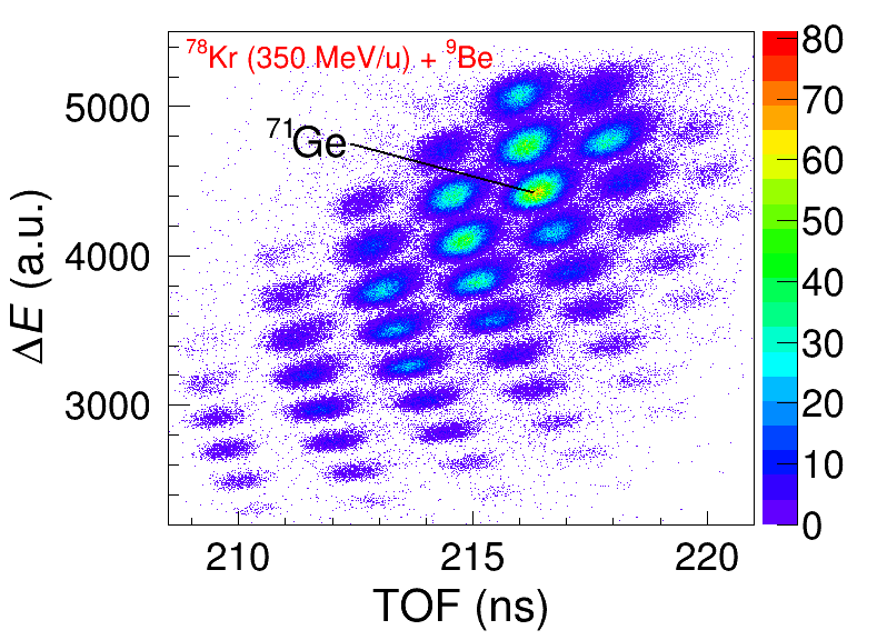 圖2:350 MeV/u氪-78束流轟擊10 mm厚的鈹靶,RIBLL2束線磁剛度按目標核鍺-71設置時,氪-78碎裂