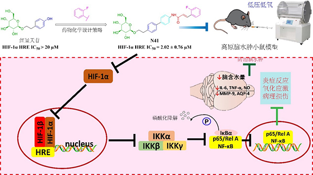 研究團(tuán)隊(duì)聚焦高原腦水腫防治重大問(wèn)題,以高原特色中草藥紅景天中的活性成分紅景天苷為結(jié)構(gòu)基礎(chǔ),基于骨架躍遷和分子雜合的藥物設(shè)計(jì)策略,通過(guò)引入鄰氟苯基HIF-1α抑制劑藥效團(tuán),對(duì)紅景天苷的糖苷鍵、連接鏈、芳環(huán)取代基等三個(gè)部分進(jìn)行結(jié)構(gòu)修飾,設(shè)計(jì)并合成了多種紅景天苷衍生物開展構(gòu)效關(guān)系研究。通過(guò)雙熒光素酶報(bào)告基因、細(xì)胞毒、ELISA等實(shí)驗(yàn),篩選獲得強(qiáng)活性化合物N41,可顯著抑制HIF-1α HRE轉(zhuǎn)錄(IC50: 2.02 ± 0.76 μM),減少C8-D1A細(xì)胞炎癥因子IL-6和NO的表達(dá)以及ROS積累,減輕氧化損傷且無(wú)明顯細(xì)胞毒性。HACE小鼠模型研究發(fā)現(xiàn),N41可有效降低HACE模型小鼠腦含水量,改善缺氧導(dǎo)致的腦組織損傷,通過(guò)阻斷HIF-1α/IKKα/NF-κB信號(hào)通路,抑制下游TNF-α、IL-6等炎癥因子及MMP-9、AQP-4等血腦屏障通透性相關(guān)因子表達(dá),緩解炎癥反應(yīng)和維持血腦屏障完整性,發(fā)揮高原腦水腫防治功效。相關(guān)研究成果發(fā)表在European Journal of Medicinal Chemistry(2025,297: 117982)上。