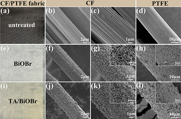 眾所周知,CF和PTFE纖維表面具有強(qiáng)化學(xué)惰性,導(dǎo)致其復(fù)合材料的界面結(jié)合性能差。在上述工作進(jìn)行摩擦學(xué)性能評價(jià)的過程中,存在大量纖維與樹脂基體脫黏拔出的現(xiàn)象,對復(fù)合材料的整體性能的發(fā)揮產(chǎn)生不利影響。近日,研究團(tuán)隊(duì)基于前期研究基礎(chǔ),在界面優(yōu)化改性方面提出了新思路。團(tuán)隊(duì)首次將BiOBr應(yīng)用于摩擦學(xué)領(lǐng)域,并提出了“軟-硬-軟”多級結(jié)構(gòu)的設(shè)計(jì)思路,通過化學(xué)浴、水熱生長和層層自組裝方法在CF/PTFE織物表面依次構(gòu)建了化學(xué)交聯(lián)的“軟”基底層(PEI/PA)、垂直取向的“硬”中間層(BiOBr納米片)以及動態(tài)配位的“軟”外層(TA/Fe3+金屬-多酚網(wǎng)絡(luò))。其改性前后的纖維表面形貌如圖1所示。