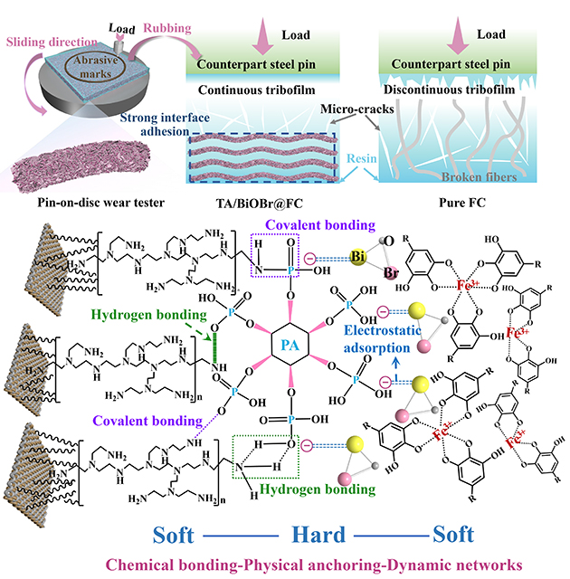 團(tuán)隊(duì)人員在此基礎(chǔ)上提出了在纖維織物表面構(gòu)建“軟-硬-軟”結(jié)構(gòu)增強(qiáng)復(fù)合材料的摩擦學(xué)性能的磨損機(jī)理。未經(jīng)改性的復(fù)合材料在受到外部擠壓和剪切力的作用下,出現(xiàn)大量的微裂紋并伴隨纖維嚴(yán)重拔出斷裂,隨后在對偶表面形成不均勻不連續(xù)的摩擦膜。而TA/BiOBr@FC經(jīng)由表界面改性,織物界面從微觀到宏觀形成了化學(xué)鍵合-物理錨定-動態(tài)網(wǎng)絡(luò)的多級增強(qiáng)體系,避免纖維-樹脂界面脫黏和纖維拔出,顯著提升了CF/PTFE纖維織物復(fù)合材料的界面性能和摩擦學(xué)性能。