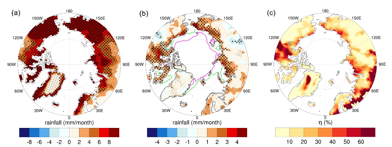 全強(qiáng)迫(a)和僅海冰消融強(qiáng)迫(b)下的北極陸地夏季降雨量的多模式平均響應(yīng),(c)海冰消融對(duì)降雨變化的貢獻(xiàn)率