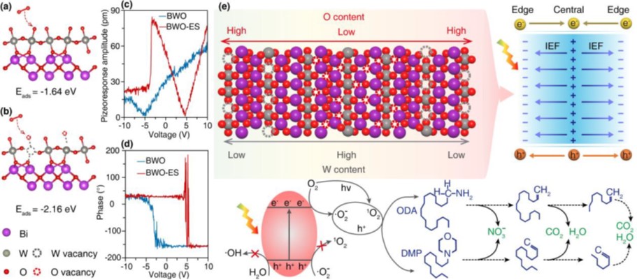 中國科學(xué)院青海鹽湖研究所輕合金與稀散元素分離課題組根據(jù)鉀鹽浮選藥劑性質(zhì)特點(diǎn),聚焦綠色高效處理的研究需要,結(jié)合高原地區(qū)自然光輻照強(qiáng)度大等優(yōu)勢,優(yōu)化光催化材料缺陷工程改性策略,成功制備金屬/非金屬雙缺陷鉍酸鹽光催化材料,考察其對可見光的吸收利用,并對雙缺陷結(jié)構(gòu)改性鉍酸鹽光催化劑的催化作用機(jī)制開展深入剖析。研究發(fā)現(xiàn),在水熱制備Bi2WO6過程中加入適當(dāng)比例的還原劑(EG)和刻蝕劑(NaOH),可以實(shí)現(xiàn)“一鍋法”在Bi2WO6納米片的中心和邊緣區(qū)域分別構(gòu)筑O缺陷和W缺陷,強(qiáng)化提升鉍酸鹽的催化性能。機(jī)理研究發(fā)現(xiàn):在雙缺陷結(jié)構(gòu)材料(BWO-ES)中,W缺陷作為負(fù)電荷中心,O缺陷充當(dāng)局部的正電荷中心。當(dāng)這些帶相反電荷的缺陷在晶格不同位置建立時(shí),使Bi2WO6材料的靜電偶極距由本體材料(BWO)的1.54 D提升至BWO-ES的48.15 D,促使材料的內(nèi)建電場強(qiáng)度提升2.74倍,為光生電子-空穴對的有效分離提供了內(nèi)部驅(qū)動力,從而抑制光生載流子的復(fù)合,表現(xiàn)的瞬態(tài)熒光壽命由BWO的1.61 ns提升至BWO-ES的2.63 ns。此外,O缺陷的構(gòu)筑降低了材料的帶隙(2.78 ev→2.54 eV),拓展了材料的光響應(yīng)范圍(446 nm→488 nm)。在可見光(λ≥400 nm)照射下,BWO-ES對十八胺(ODA)和十二烷基嗎啉(DMP)的降解速率分別達(dá)到13.31 mg/L·h和14.40 mg/L·h,是本體BWO材料降解速率的3.64倍和3.59倍,可實(shí)現(xiàn)鹽溶液中ODA、DMP的完全礦化。