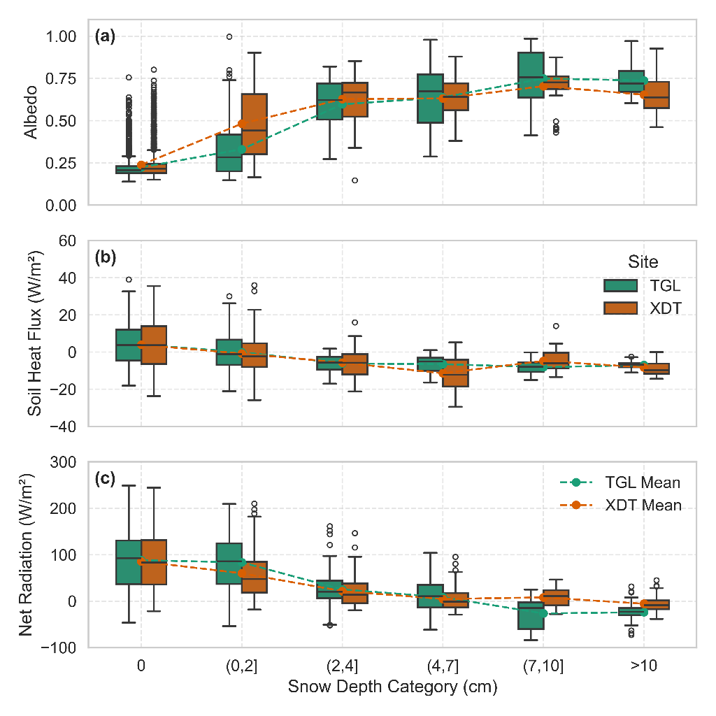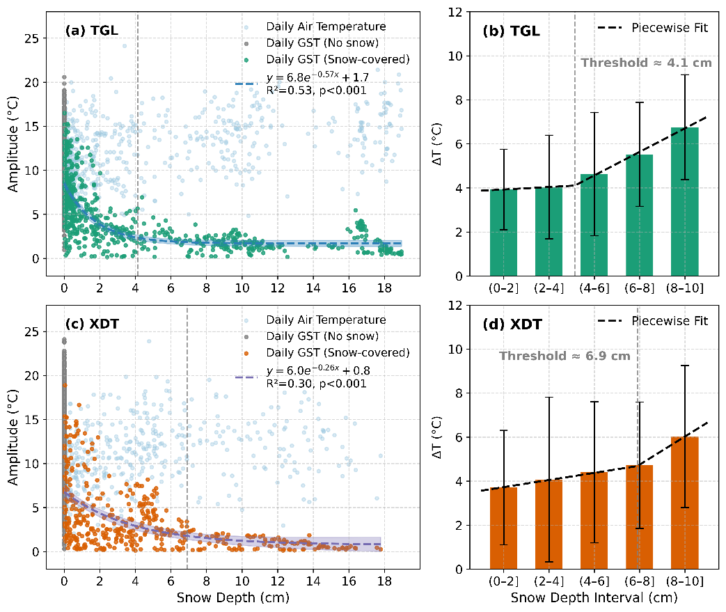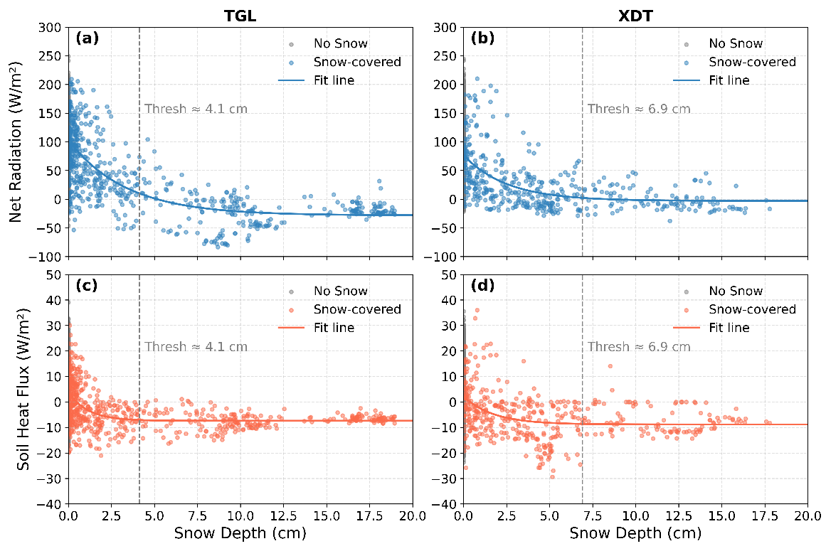 研究發(fā)現(xiàn),當(dāng)雪深超過(guò)4.1 cm(唐古拉)與6.9 cm(西大灘)時(shí),地表溫度振幅顯著收斂、保溫效應(yīng)確立;而在<2 cm的淺雪條件下,強(qiáng)反照率與融雪潛熱耗散導(dǎo)致地表冷卻強(qiáng)化。同時(shí),地表凈輻射與土壤熱通量隨雪深呈非線性衰減并趨穩(wěn)。