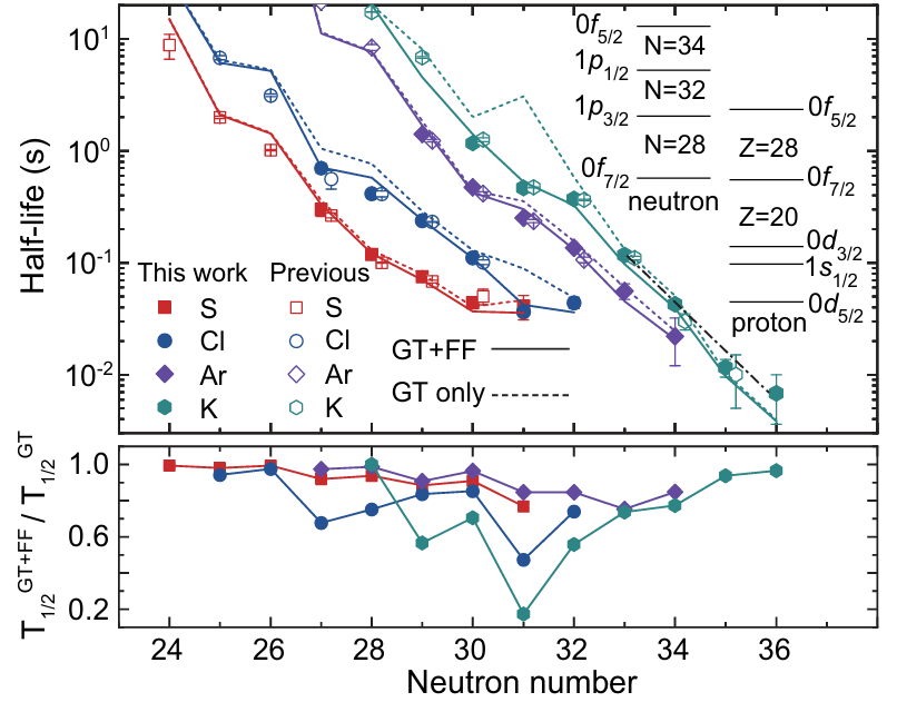圖2:上圖:豐中子S、Cl、Ar和K同位素的β衰變半衰期系統(tǒng)性。實(shí)心符號表示本次實(shí)驗(yàn)的測量值,空心符號為文獻(xiàn)值。實(shí)線和虛線分別展示了同時包含GT和FF躍遷以及僅考慮GT躍遷的殼模型理論半衰期。黑色點(diǎn)劃線用以突出54K35半衰期的偏離系統(tǒng)性下降。相關(guān)的中子、質(zhì)子軌道顯示在了右上角。下圖:包含F(xiàn)F和GT躍遷的理論半衰期與僅考慮GT躍遷的理論半衰期之比