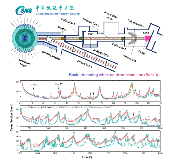 在中子俘獲反應(yīng)研究方面,研究團(tuán)隊基于中國散裂中子源反角白光中子束線(CSNS Back-n),利用高純度銠-103靶材開展了1eV-1MeV能區(qū)中子俘獲反應(yīng)截面的直接測量。實驗結(jié)果表明,國際主要評價數(shù)據(jù)庫ENDF/B-VIII.1,JEFF-3.3和JENDL-5中11.9 eV和33.0 eV處標(biāo)注的共振能級并不存在。分析認(rèn)為,上述數(shù)據(jù)庫中的共振峰可能源于早期實驗樣品中鉑族元素鈀(108Pd)與鉑(195Pt)雜質(zhì)的貢獻(xiàn)。此外,基于CSNS Back-n束流的高注量率和優(yōu)異的飛行時間分辨能力,本次實驗首次發(fā)現(xiàn)了銠-103的8個新共振峰,并利用R-矩陣程序SAMMY提取了相應(yīng)的共振參數(shù)。