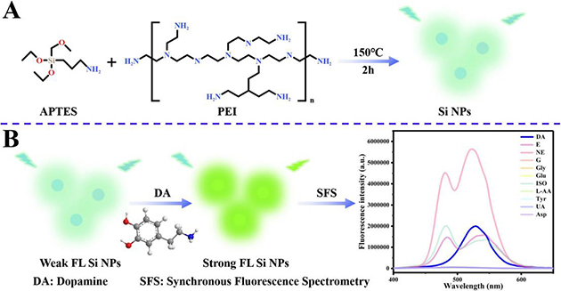圖1. A Si NPs的制備示意圖;B 基于Si NPs的DA檢測示意圖