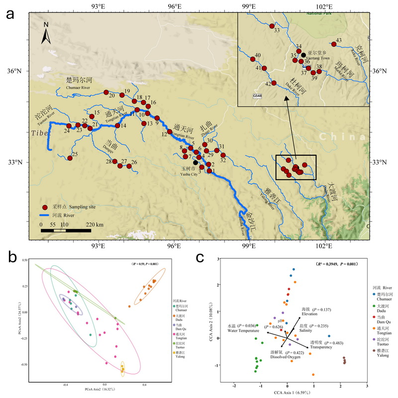 a 青藏高原長江源區(qū)調(diào)查采樣點示意圖;b 長江源區(qū)各水系魚類群落主坐標分析圖;c 長江源區(qū)各水系魚類群落典范對應(yīng)分析圖
