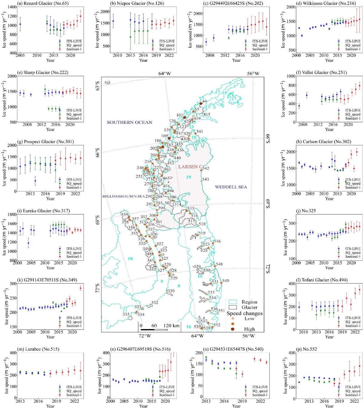 中國科學(xué)院西北生態(tài)環(huán)境資源研究院冰凍圈科學(xué)與凍土工程全國重點實驗室康世昌研究員團隊,通過2018–2023年Sentinel-1 SAR影像反演獲得6181組有效冰川流速數(shù)據(jù),系統(tǒng)揭示了南極半島冰川流速的時空變化特征及空間差異規(guī)律。