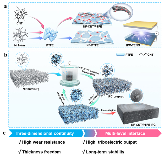 研究人員還研究了無機填料引入對泡沫鎳-聚四氟乙烯互穿相復(fù)合材料性能的增強機制,結(jié)果表明,碳納米管在三維微米泡沫鎳表面形成納米網(wǎng)狀結(jié)構(gòu),促進了界面應(yīng)力傳遞與熱量耗散,顯著提升了力學(xué)強度與導(dǎo)熱性能。得益于泡沫鎳與碳納米管形成的三維微/納網(wǎng)絡(luò),復(fù)合材料輸出電流提高至1.5μA,是純聚四氟乙烯的30倍。摩擦起電響應(yīng)長效穩(wěn)定,與不同摩擦副具有普適性,展示了互穿相復(fù)合材料具備優(yōu)異導(dǎo)電特性,可作為高效能量收集的摩擦電材料。相關(guān)研究結(jié)果發(fā)表在Small(2025, 21(5):2409607)上。