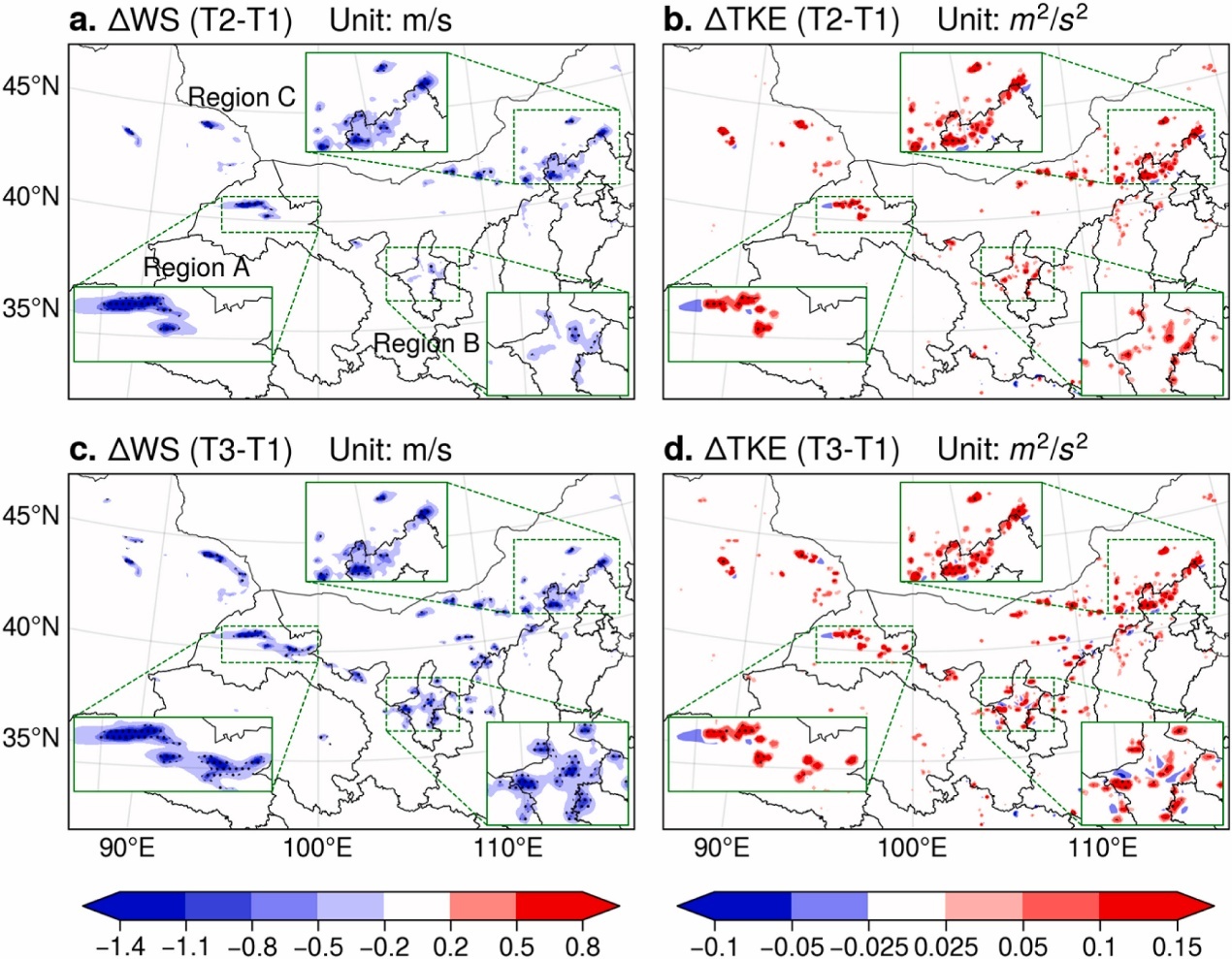 中國科學(xué)院西北生態(tài)環(huán)境資源研究院余曄研究員團(tuán)隊(duì),利用耦合風(fēng)電場(chǎng)參數(shù)化方案與動(dòng)態(tài)植被模塊的區(qū)域氣候模式,系統(tǒng)模擬評(píng)估了我國北方大規(guī)模風(fēng)電場(chǎng)群的潛在環(huán)境影響,揭示了風(fēng)電場(chǎng)群擾動(dòng)局地及區(qū)域氣候、進(jìn)而影響植被生長的作用機(jī)制。